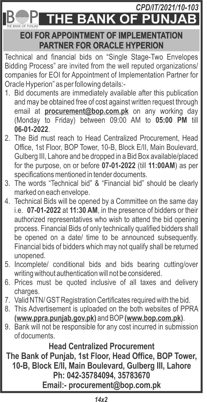 Procurement of Ceiling Panel Lights for BOP Tower Lahore (12 thApril, 2023 to 03rd May, 2023)
